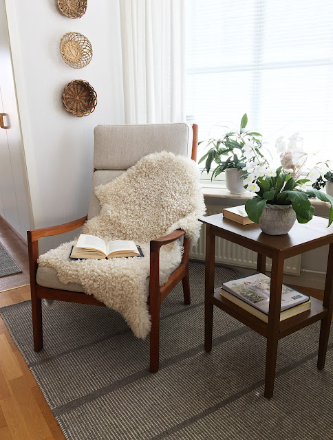 Men just nu ligger fårskinnet där. Och en bok, såklart. Om ni undrar var 60-talsfåtöljen jag nyss klädde om tagit vägen så ska den flytta ner till Göteborg. Passade inte min rygg så bra vilket jag tror den här kommer göra.