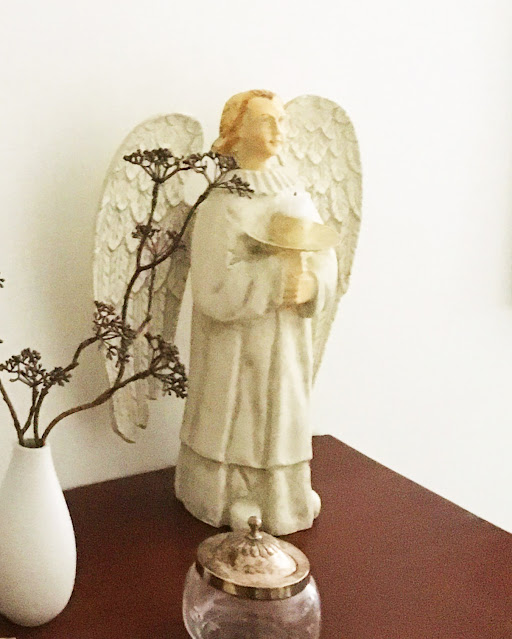 Ängeln som står på byrån tycker jag så mycket om och har visat många gånger. Nu blev det en gång till. Den köpte jag på julmarknaden vid Falu gruva en gång för sådär tjugo år sen. Platsar bra nu när advent anas bakom hörnet. Advent... en av mina längtor. Snart är den här!