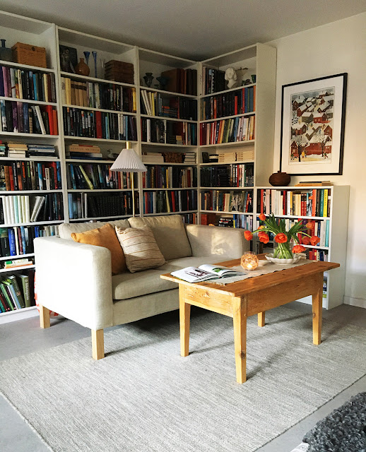 ... soffbord! Precis som några av er misstänkte. Med den vita färgen borttagen och benen avkortade blev det så som jag hoppades. Redan efter ett par dagar känns det som om det alltid stått här. Och om jag hade vissa betänkligheter när jag kortade benen på det gamla bordet så fick de ge vika för den nya mer användbara funktionen. Det nya livet!
